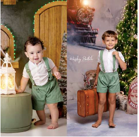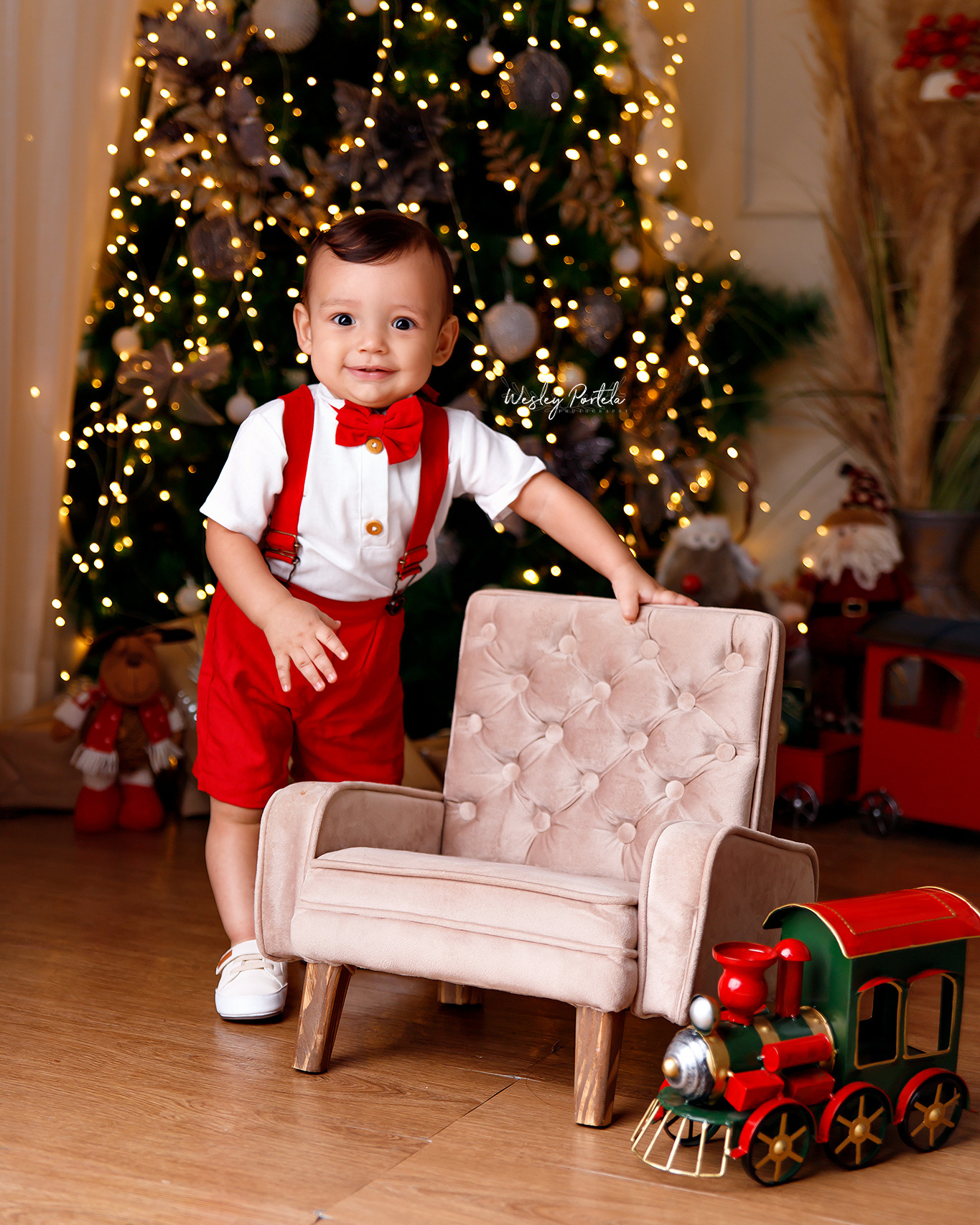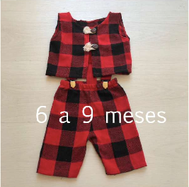 Conjunto - bermuda e colete xadrez vermelho e preto com suspensório vermelho.